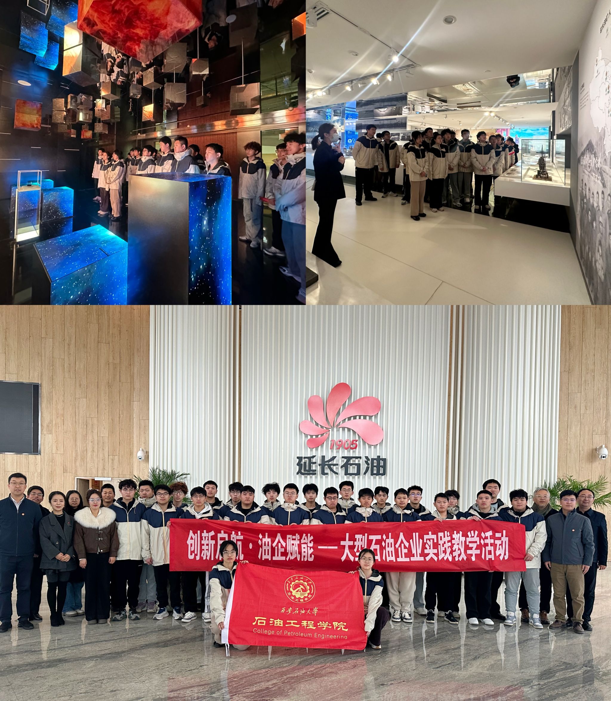 221日,在延长石油(集团)有限责任公司展览馆,古朴的木质井架,泛黄的《延长石油官厂章程》,锈迹斑斑的顿钻钻头,动态演绎陕北石油地质构造的透明交互屏,无一不体现着这座百年油田的历史风貌。在“时光走廊”全息剧场,同学们目睹1907年延1井喷油的震撼场景与当代页岩油立体开发的数字孪生模型同框辉映,通过“历史场景还原+未来技术预演”的独特叙事,激励青年学子在百年油脉中汲取力量,于“双碳”征程上勇毅前行。