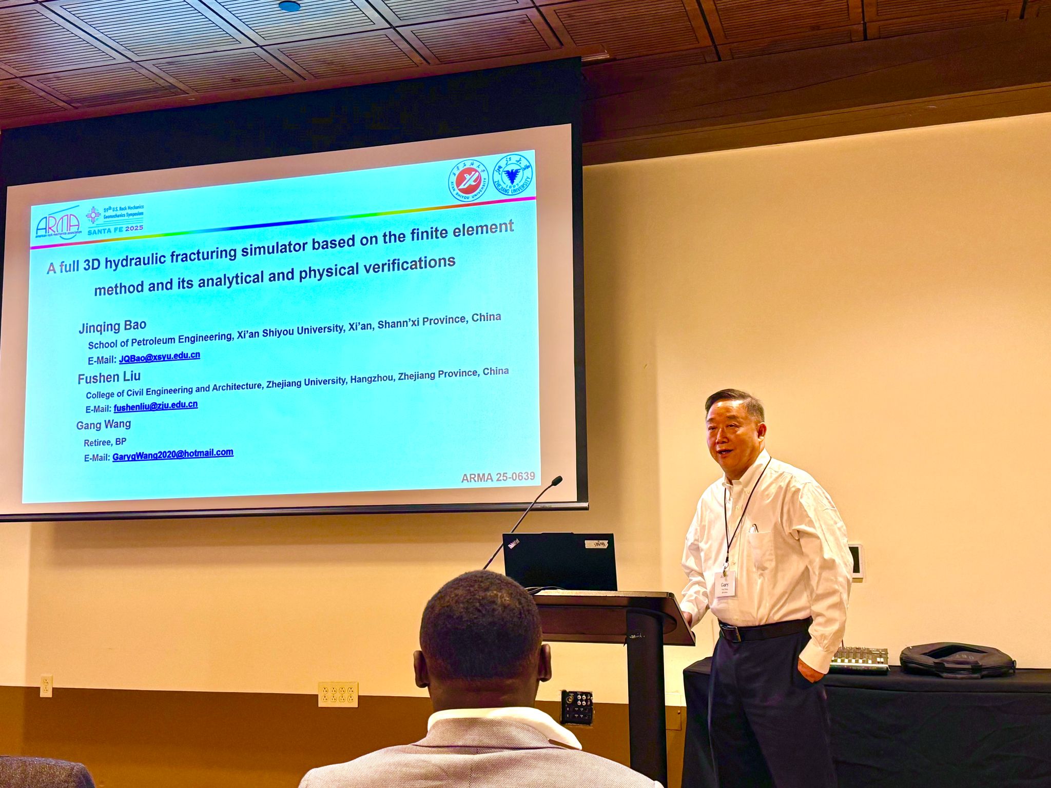 610日,咪咕体育 包劲青老师科研团队参加了2025年美国岩石力学与地质力学大会,并在非常规石油岩石力学分会场作“A full 3D hydraulic fracturing simulator based on the finite element method and its analytical and physical verifications”专题研究报告。