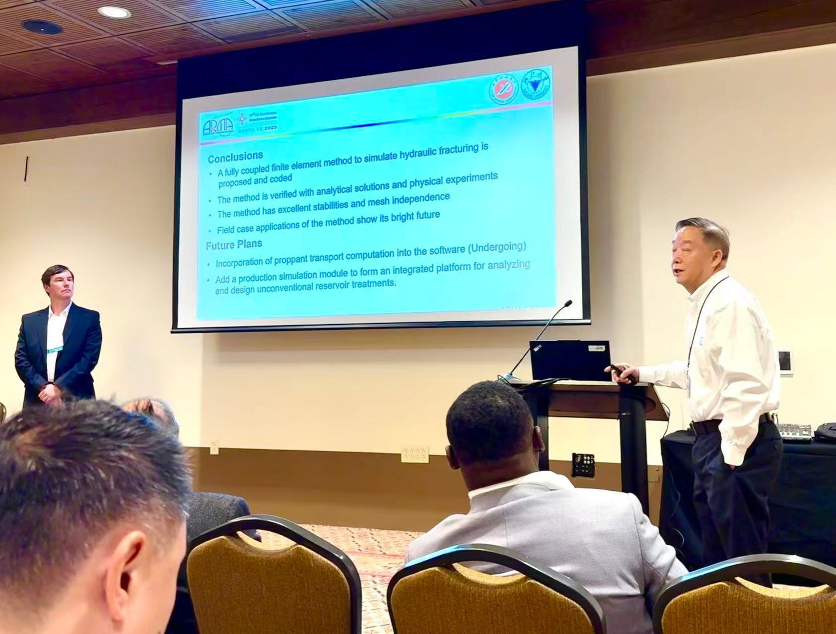 报告介绍了包劲青老师科研团队近些年在水力压裂有限元数值模拟方面的研究工作,其内容引起了国际石油公司入会代表和相关学者的浓厚兴趣。部分入会专家认为研究成果实现了水力压裂理论、实验和数值模拟三者完美的统一,为有限元方法开发水力压裂优化设计软件奠定了坚实的理论基础。美国岩石力学与地质力学大会是享誉世界的学术大学。今年的大会在美国新墨西哥州圣达菲举行,非常规石油岩石力学分会场的近百名参会代表来自Exxon MobilBPTotalShell等石油企业,以及美国明尼苏达大学、犹他大学和加拿大英属哥伦比亚大学等高等院校。
