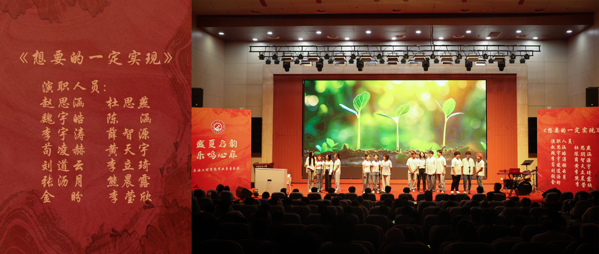 纯净清澈的《想要的一定实现》阿卡贝拉率先响起:错落交织的人声编织出充满希望与决心的乐章,错落有致的和声仿佛是初代教育工作者们立下的铮铮誓言,笃定要在石油教育领域开拓出一片新天地。
