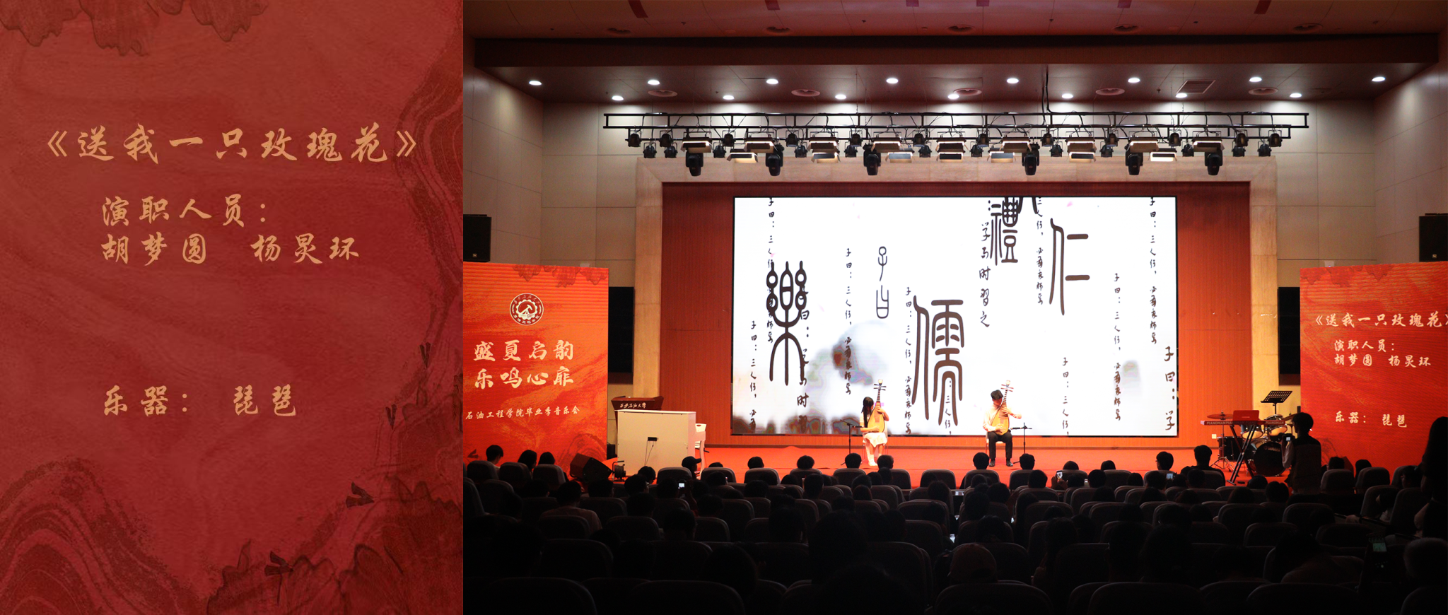 随着教学楼一栋栋拔地而起,师资队伍逐渐充实,莘莘学子怀揣梦想纷至沓来,课堂上的思想碰撞、校园里的青春朝气,如同繁花盛开、争奇斗艳,琵琶二重奏《送我一支玫瑰花》以热烈的曲风,明快的节奏,演奏出学校在建设初期时稳步向前,不可阻挡的欣欣向荣的景象。