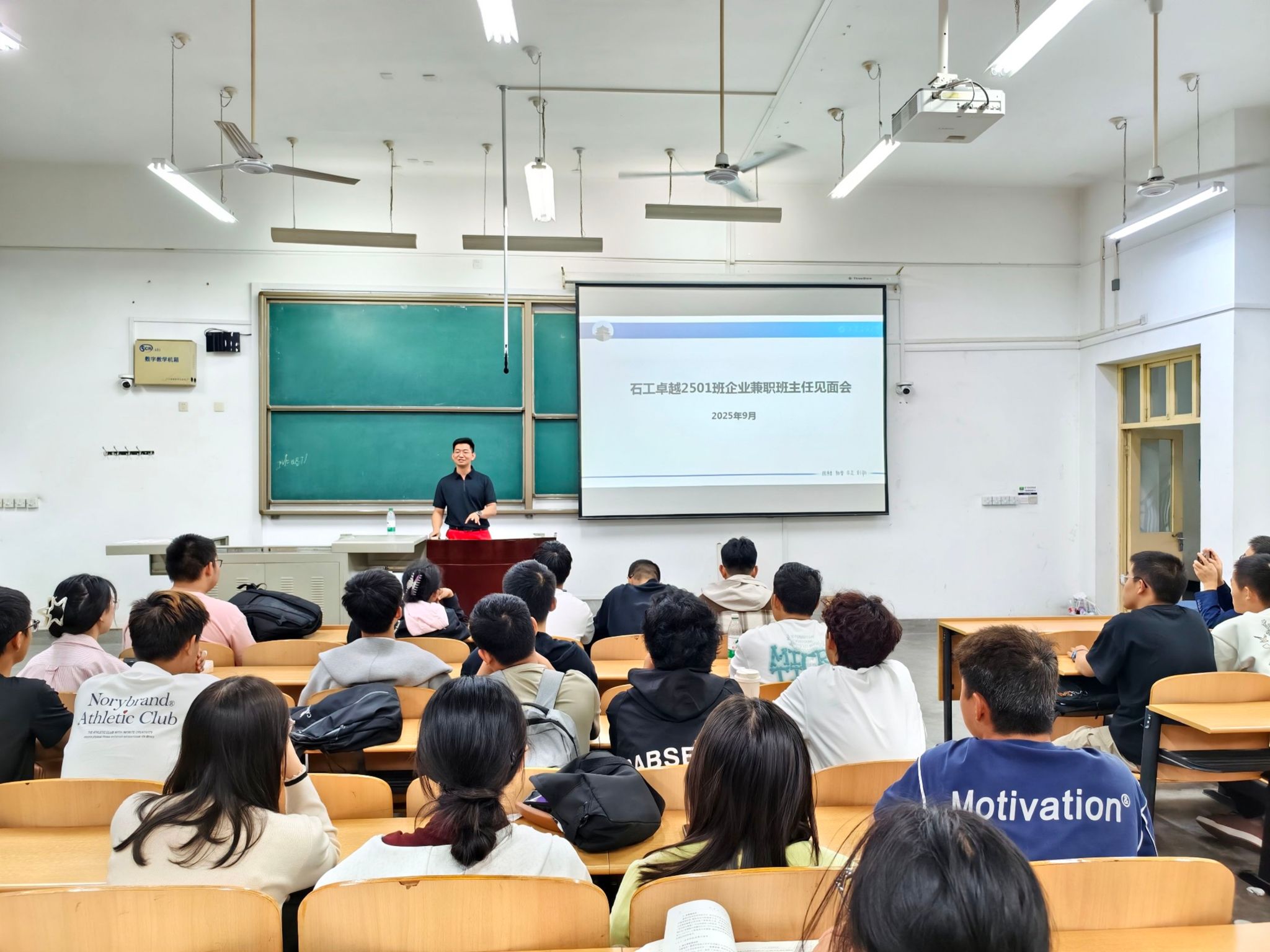 在博思楼208教室,陈建国组织召开了石工(卓越)2501班首次线下班会,他勉励同学们要传承发扬石油精神、铁人精神,树立为祖国献石油的远大理想,在服务行业发展中实现人生价值。