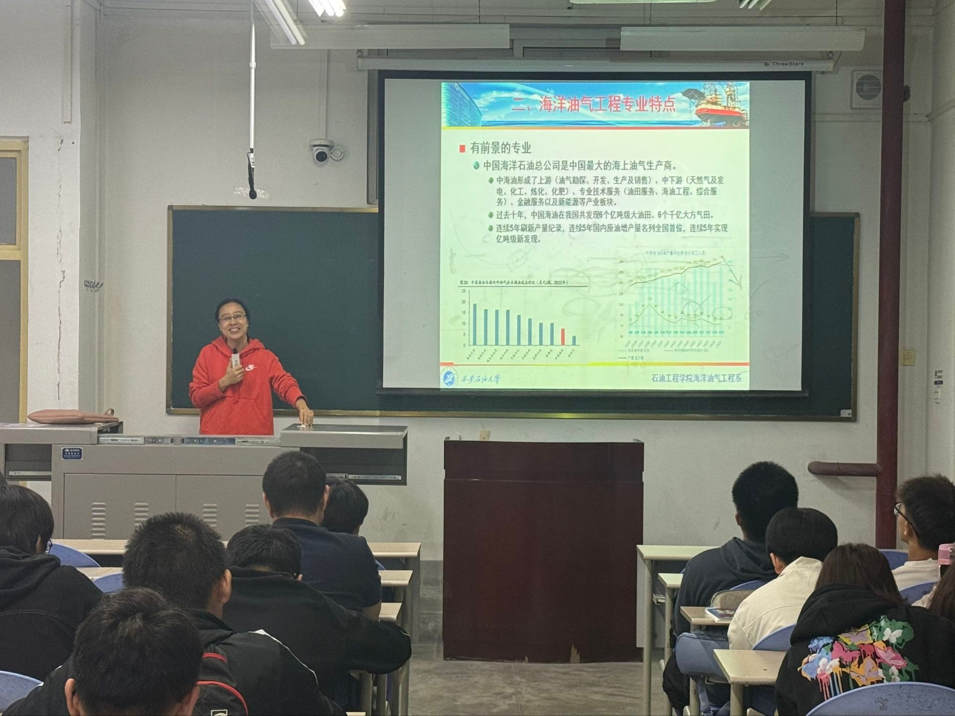 同日下午,蒋海岩教授在博览楼A225为海油2501、2502班开展专业教育。她结合海洋油气工程的实际需求,强调学生需扎实掌握专业理论、工程技能及外语计算机应用能力,同时具备团队协作与创新意识。现场还展示了专业实验室设备及获奖成果,激励学生以行业标杆为榜样,不断追求卓越。