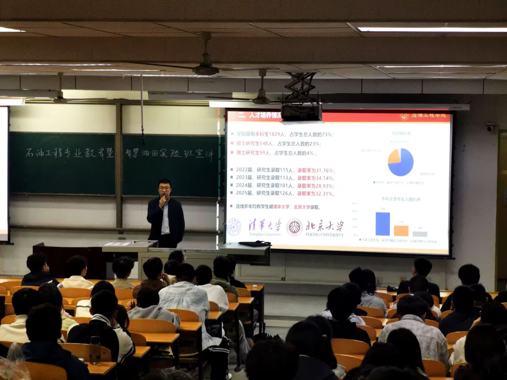 10月11日下午,王琛在博览楼A139为石工卓越2501、2502班和石工2501—2506学生开展专业教育。他详细介绍了咪咕 整体情况,人才培养情况和教学改革创新方面的基本情况。重点围绕咪咕 近年来在教学改革方面的举措,包括设立“智慧油田实验班”,以“油气工程+人工智能”为特色,通过小班化、前沿性教学模式,培养兼具工程实践能力和创新思维的高层次人才。他鼓励学生充分利用咪咕 资源,积极参与学科竞赛和科研项目,提升国际化视野与跨学科能力