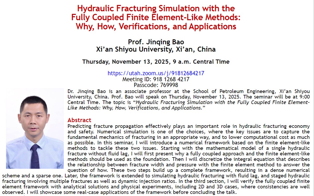 1113日,咪咕体育 包劲青教授应美国岩石力学学会(American Rock Mechanics Association, ARMA)水力压裂分会的邀请,作在线国际学术报告。包劲青教授的报告题目为Hydraulic Fracturing Simulation with the Finite Element-Like Methods: Why, How, Verifications, and Applications