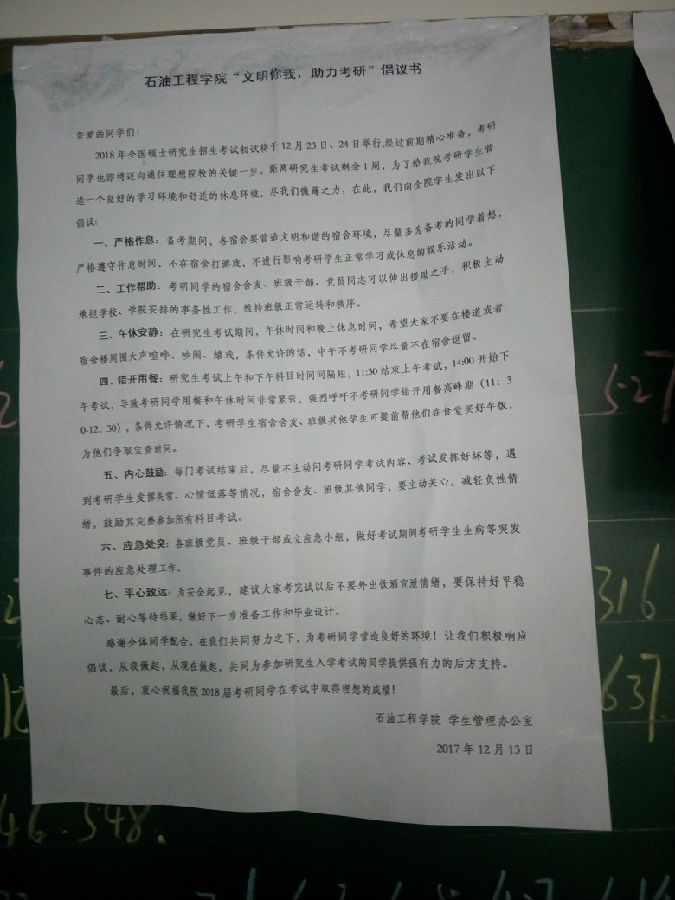 本次倡议书从严格作息、工作帮助、午休安静、错开用餐、内心鼓励、应急处突、平心致远等七个方面向全院学生发出倡议,呼吁全体同学从我做起,共同为参加研究生入学考试的同学提供强有力的后方支持。