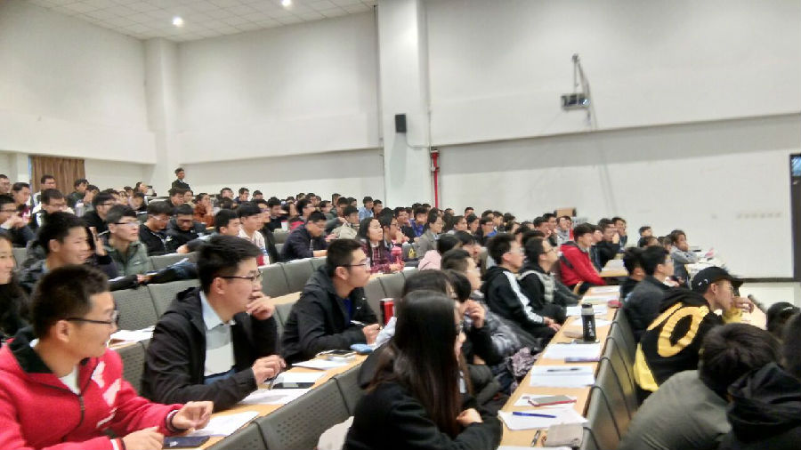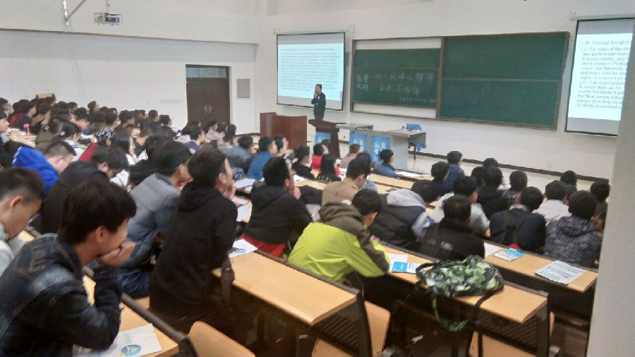 郭老师首先概括了2018年6月份四级出题规律并详细介绍了试卷中选词填空以及阅读理解的应试技巧。其次,针对四级听力,郭老师指出要听懂听力主要要“练嘴”,次要学会听发音找关键词,根据常识判断选项等一些非常实用的应试技巧。最后,他对同学们提出了“四要四不要“的建议,对同学们寄予殷切的期望。讲座期间,郭老师用轻松幽默的话语营造一个愉悦的环境。使同学们对四级有了浓厚的兴趣。