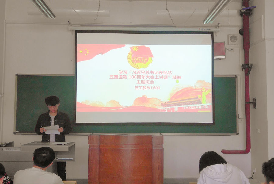 为深入学习习近平总书记在纪念五四运动100周年大会上讲话精神,加强学生自我思想教育,5月17日上午咪咕体育 石工教改1601班在鄠邑校区A125召开“学习习近平总书记在纪念五四运动100周年大会上讲话精神”主题班会,本次班会由班级团支部书记董鹏举主持,班主任彭娇老师及全体同学参加。