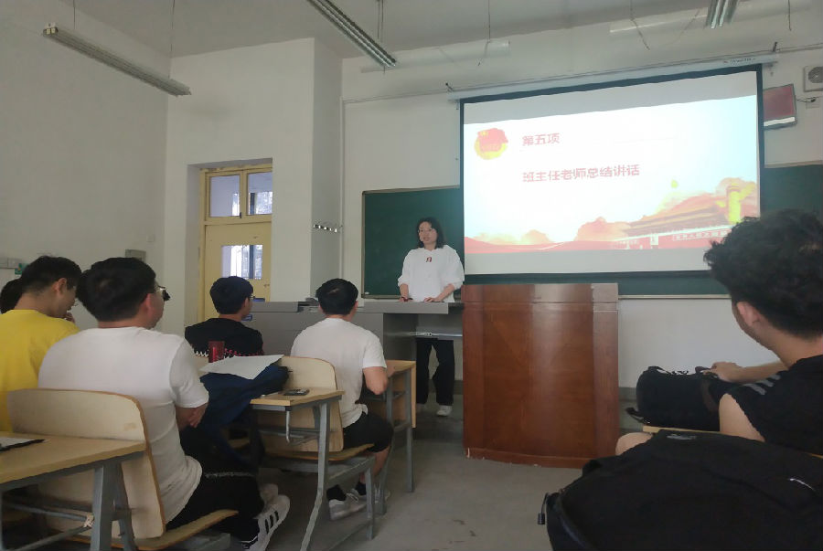 最后,班主任彭娇老师作总结发言。彭老师谈到,今年是五四运动100周年,也是中华人民共和国成立70周年,加强青年爱国主义教育责任重大,本次集中学习意义深远,并指出作为当代大学生应当从自我做起注重实践,让爱国主义体现在实际行动中。会上她对全班同学提出四点具体要求:首先,提高思想觉悟,关注时政;第二,增强爱国主义情怀,将个人利益与国家利益相统一,发扬五四精神,做对国家有用之人。第三,提高自身学习能力与素质,在考研与就业中合理选择,合理规划自己的人生。第四,提高品德修为,做诚信之人,扎实完成好大学每一阶段的学习任务。