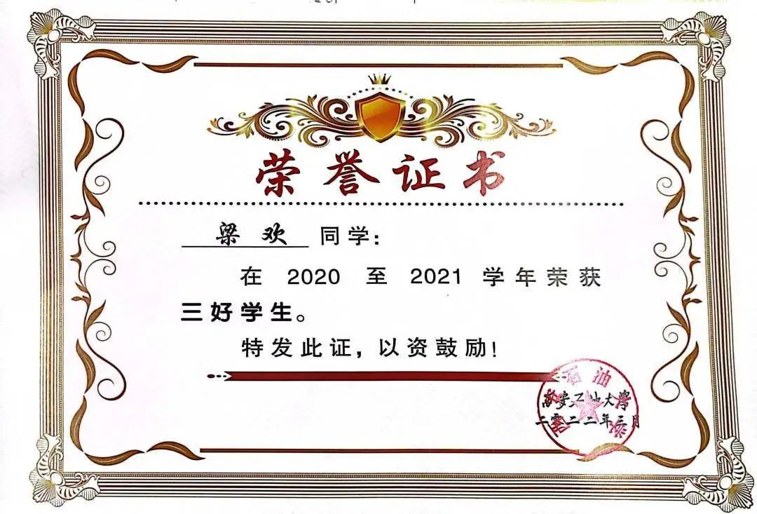从步入西安石油大学起,梁欢就认真对待所接触到的每一门课程,除此之外,他会积极借助学校提供的各种资源进行自我充实,如名师讲座、网络公开课以及课程素质拓展等,主动去阅读学科专著与专业学术论文,与老师同学探讨各种学术问题。梁欢对学业的尊重与主动,也进一步激励了他对本专业的学习兴趣,自入学以来,他累计获得国家励志奖学金、品学兼优奖学金、三好学生、优秀共青团干部、创新之星等10余项荣誉称号。