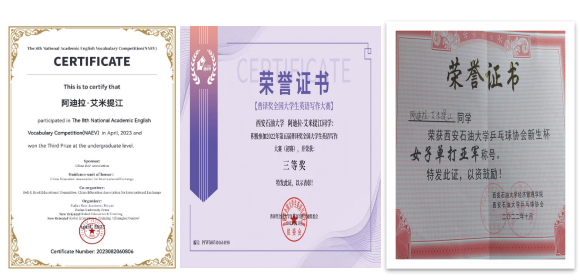 2022-2023学年平均绩点4.11,排名专业第一。2023年6月份以593分通过英语四级考试。在学业上,她不断进取,积极参与各项学科竞赛,在第八届全国学术英语词汇大赛中获得省级三等奖,普译奖英语写作大赛中获得校级三等奖。在体育运动方面,她参加西安石油大学乒乓球协会举办的新生杯乒乓球比赛并获得女子单打亚军,参加咪咕体育 运动会,获得女子800米三等奖等。