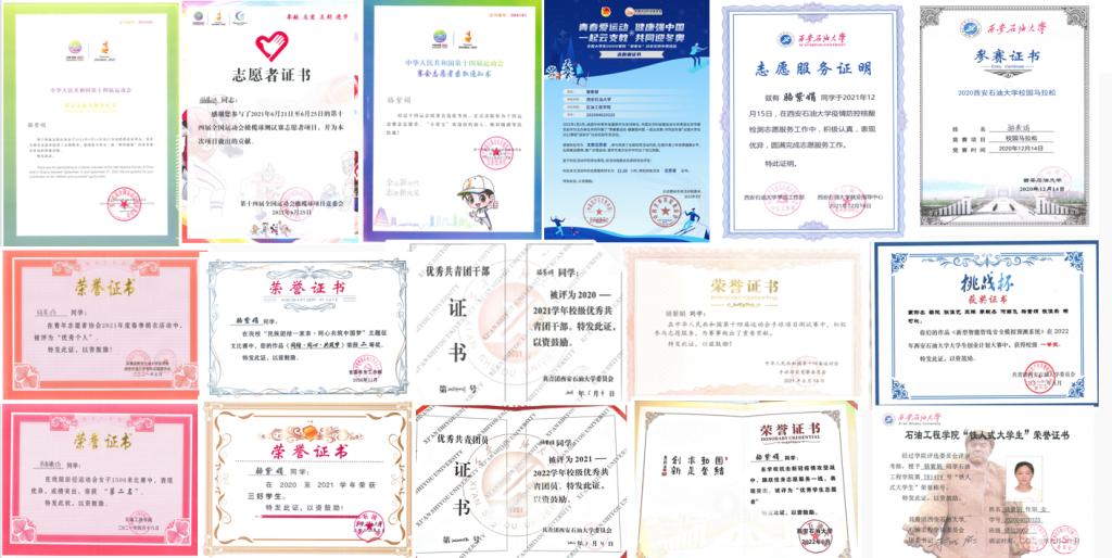 在大一时,她积极参加了很多活动,也取得了不错的成绩。像征文比赛、迎新晚会、校园马拉松等既丰富了她的课余生活也锻炼了她的写作表达能力。在工作中,她担任班级组织委员,同时也是青年志愿者协会副部长,本着对同学的负责任和对志愿服务的热诚恪尽职守,兢兢业业。连续两年获得优秀共青团干部称号组织参与了学校的捐衣、敬老、支教等一系列志愿活动。在2021成为第十四届全国运动会的志愿者,参与手球和橄榄球两项赛事的志愿服务。2022年参与冬奥会云之教志愿服务,成为支教志愿者。随着疫情的起伏,也加入到了学习抗击疫情的团队中去。进行核酸工作的值班协调,校园周边巡逻,宿舍楼执勤等一系列防控工作。除此之外,在家乡的社区,她也套上了防护服,为居民们进行健康检测和配送物资等。她始终热衷于志愿服务,且把奉献社会作为不懈追求的优良品德。