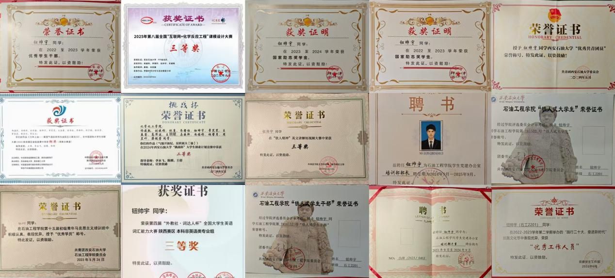 在学业生涯中,钮帅宇始终以严谨的态度深耕石油工程专业知识,凭借扎实的学习功底和高效的学习方法,取得了GPA 3.83/5.0、专业排名7/245的优异成绩,其中核心课程成绩突出,多门课程均达90分及以上,并一次性通过英语四六级考试,展现了他对专业知识的精准掌握。他积极参加科研竞赛,曾荣获中国国际大学生创新大赛省级铜奖、全国大学生英语竞赛C类二等奖等,并主持一项国家级大学生创新训练项目,凭借着这份认真的学习态度,他多次获得国家励志奖学金、获得“铁人式大学生”、“铁人式学生干部”、“优秀共青团员”、“优秀共青团干部”等荣誉称号。